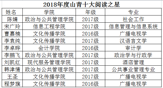 为营造良好的校园文化,激发广大读者的阅读热情,图书馆联合校团委共同举办“2018年度山青十大阅读之星”“2018级山青十大阅读新星”的评选活动。经过读者自荐与图书馆的数据查询,现将评选结果公告如下: