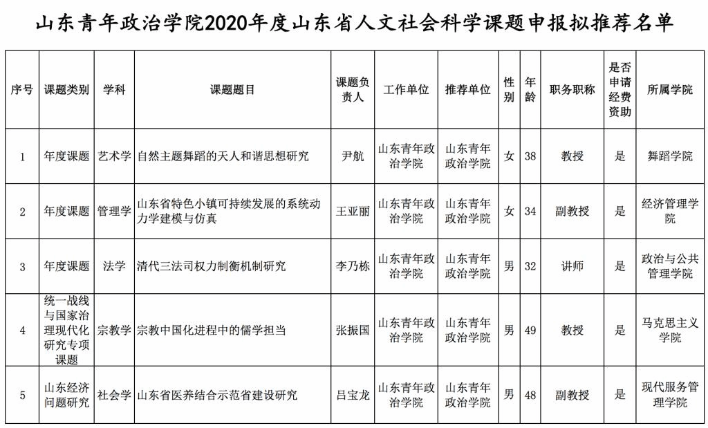 根据山东省社会科学界联合会《关于申报2020年度山东省人文社会科学课题的通知》要求,学校组织了2020年度山东省人文社会科学课题的申报工作。本次共有10个学院的43位教师提交了申报书。经教师申报、学院初评、科研处审核、校外专家网络评审,拟推荐以下课题申报本年度山东省人文社会科学课题(排名不分先后),公示如下: