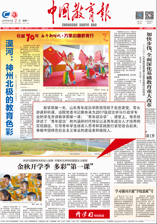 9月2日,《中国教育报》头版刊发题为“金秋开学季 多彩‘第一课’”的综合通讯稿,对全国大中小学举办各具特色、别出心裁的开学第一课,开展形式多样的爱国主义教育进行了全面报道。其中,对我校领导班子走进课堂,带头讲课和听课进行了专题报道。