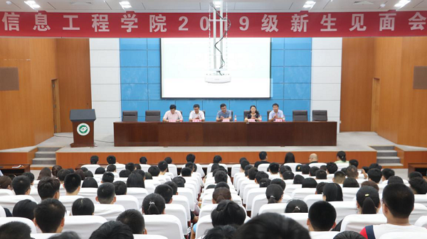 9月1日,信息工程学院2019级新生见面会在图书馆西报告厅召开。学院院长宁玉富、党总支书记李朝晖、副院长郑磊、党总支副书记马骋,军训团全体教官、新生辅导员、班主任以及2019级全体新生参加会议。会议由团总支书记、学工办主任赵可心主持。
