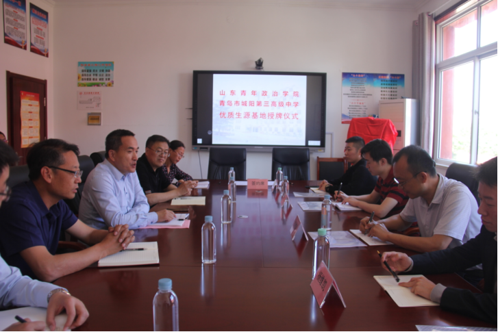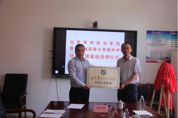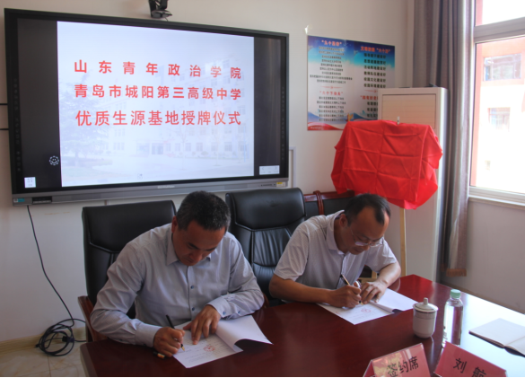 5月28日,山东青年政治学院与青岛市城阳第三高级中学共建优质生源基地签约暨授牌仪式在城阳第三高级中学举行。经济管理学院党总支书记辛德军、辅导员赵飞和青岛市城阳第三高级中学副校长陈文龙及学校相关领导共同出席。