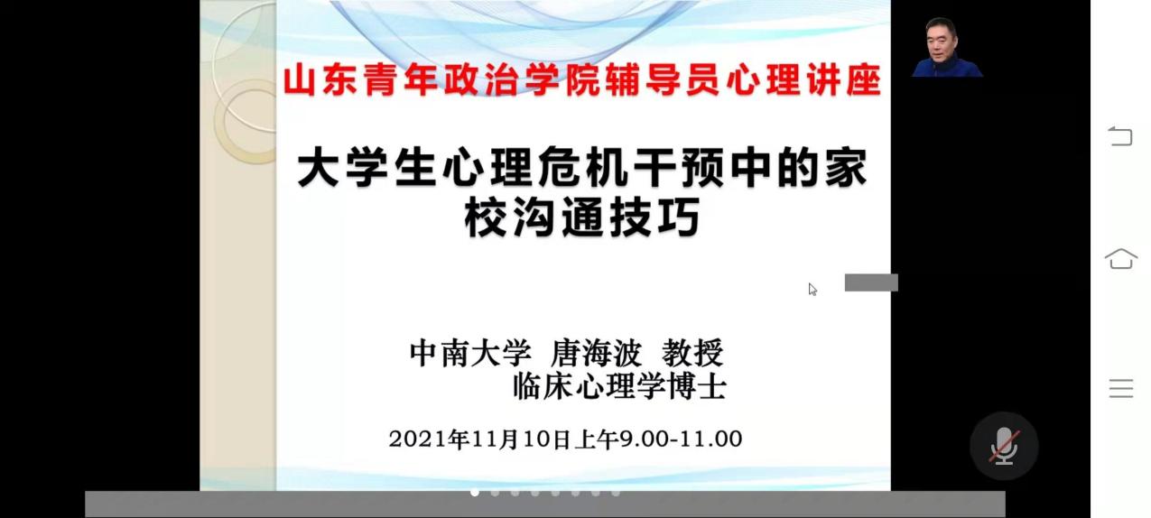 为进一步加强和改进我校大学生心理健康教育工作,切实提升辅导员心理健康教育技能水平,11月10日,我校再次邀请到中南大学心理健康教育与咨询专家唐海波教授开展了以“大学生心理危机干预中的家校沟通技巧”为主题的心理健康教育能力提升第二期专题网络培训。讲座由学生工作部(处)大学生心理健康教育咨询中心副主任李洁主持,全体辅导员及东部高校联盟高校教师参加此次培训。