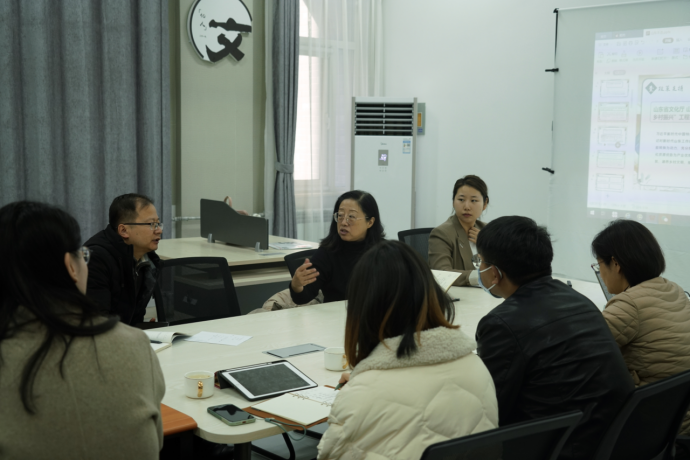 刘绍芹院长强调,要扩大非遗文化的影响力,首先要做的是深入挖掘手造非遗的亮点特色,围绕传承和传播非遗文化,立足非遗的生活化、产业化发展方向,进一步完善相关功能配套,形成集研学、工作坊、文化沙龙等多业态于一体的聚集地,打造文化展示、文化体验、文化消费的新亮点,使传统手工技艺更有效地融入脱贫攻坚战略,激活乡村发展的新机制。王连峰书记聚焦于以非遗文化为发力点的科研新方向,提出应有宏观、中观、微观等不同层面上的分工与配合,采用比较研究、文献研究等研究方法,开阔思路,充分挖掘优势,从而寻求研究与合作项目。各位专任教师就“山东手造”新媒体矩阵项目、非遗文化的保护传承等问题发表了自己的看法,展开了热烈讨论。