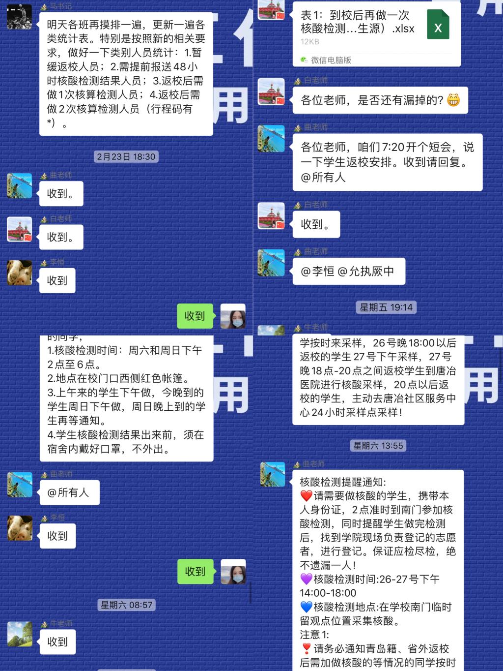 信息摸排有精度。按照《山东青年政治学院2022年春季开学工作方案》要求,学院将各年级学生信息分类汇总,与学生“点对点”沟通,确认学生返校信息,力求摸排全面精确,为后续工作做好数据支撑。根据学生现居住地,逐一排查重点地区学生,结合各地疫情防控局势、学生前期每日健康汇报及轨迹变动情况,判断学生能否返校,对学生返校工作中重点人群和“应检尽检”人员进行详细摸排,强调辅导员要对学生做好教育工作,引导学生严格遵守返校报到期间的各项规定。同时做好线上疫情防控教育工作,通过学院微公号等平台讲解新冠肺炎疫情防控相关要求,让学生明确返校期间、返校途中和返校之后的防控知识和技能。