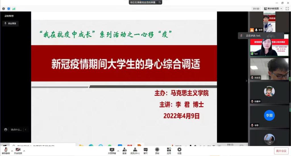 为切实增强疫情防控中的大学生心理适应能力,缓解学生心理压力,4月9日晚,马克思主义学院邀请济南军区总医院心理科门诊专家李君为马克思主义学院全体学生做了题为“新冠疫情期间大学生的身心综合调整”心理专题讲座。讲座采用线上直播的方式,由马克思主义学院魏晓娟教授主持。