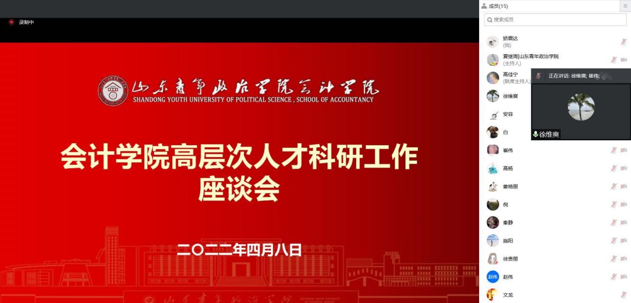 会计学院于4月8日组织召开了高层次人才科研工作线上座谈会。会计学院领导、学院高层次人才、科研岗教师等参加了座谈会。会议由副院长崔伟主持。