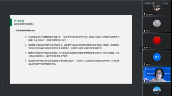 杜禹首先从语言景观的定义、产生背景和主要功能进行话题的切入,详细阐述了课题选题的缘起,然后就语言景观的研究对象、现实意义和研究现状进行了整体介绍。她以青岛德国风情街语言景观调查研究为例,结合相关的研究理论与方法进行了实证研究的过程性分享,同时提出了课题研究所面临的挑战。该研究视角新颖独特,使大家耳目一新,引起广泛讨论。
