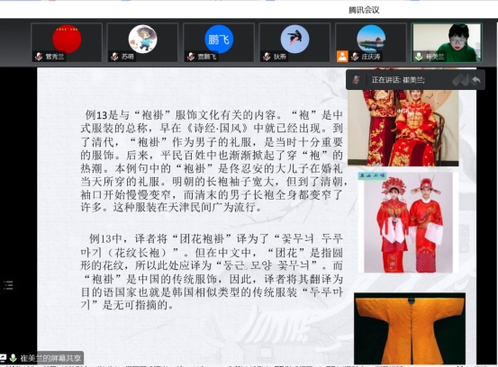 在沙龙的第二阶段,崔美兰立足于自身从事文学翻译的经验,为大家现场解读了冯骥才长篇小说《三寸金莲》中蕴含的文化素,并以文化素的内涵及其翻译策略为中心剖析文学翻译过程中的注意事项,并为大家解答了文学翻译跨文化阐释中的困惑,开拓了沙龙参与者的文学翻译视野。