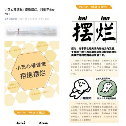 把准时间节点,在微信公众号等平台推送“开学季,不EMO”、“又是一年考研放榜时,感谢一直努力的自己”、“新学期心开始——心理调适小技巧”、“小艺心理课堂|大学生恋爱的正确打开方式”、“小艺心理课堂|拒绝摆烂,对躺平Say No!”等心理专题推文,充分利用网络思政平台,打造线上心灵驿站,传播心理健康相关知识;组织学院全体学生观看“新学期‘心’开始——心理调适及应对策略”线上心理健康知识讲座,助力学生适应校园生活,为学生成长营造健康向上、积极乐观的氛围。