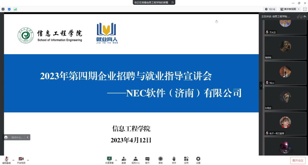 为全力做好2023届毕业生就业工作,抢抓春季促就业工作关键期、冲刺期,促进毕业生积极求职、顺利应聘、更好就业,信息工程学院于4月12日开展2023年第四期企业招聘与就业指导宣讲会。会议邀请NEC软件(济南)有限公司边城老师作为主讲嘉宾,2023届毕业生、其他年级部分学生参会。