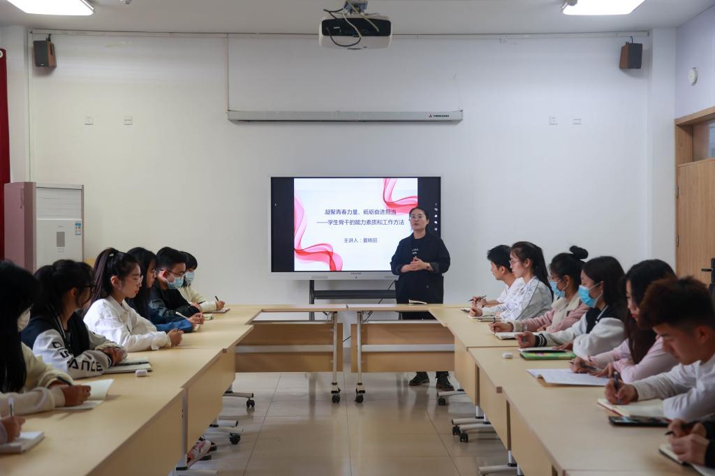 讲座伊始,夏晓丽从党的二十大报告中对青年的要求出发,围绕如何做一名优秀学生骨干为主题,与现场学生进行互动交流,引发学生们思考。紧接着她从学生骨干的角色定位、作用发挥、素质要求、工作方法四个方面详细展开,阐述了学生骨干的重要性,并就如何成为优秀学生骨干进行重点分享。她希望全体学生骨干:一是要有坚定的政治信仰,立场坚定、是非分明,与时代同向同行。二是要努力练就过硬本领,通过不断学习、思考、实践,持续提升能力,增长才干;三是要有奋斗担当精神,作为学生骨干,要有责任意识和服务意识,要主动担当,乐于奉献,奋斗前行。四是要有良好的心理素质。要强化干事信心,不畏艰难险阻,努力平衡学习与工作关系,提高执行力,通过不懈努力,真正成为一名优秀学生骨干。