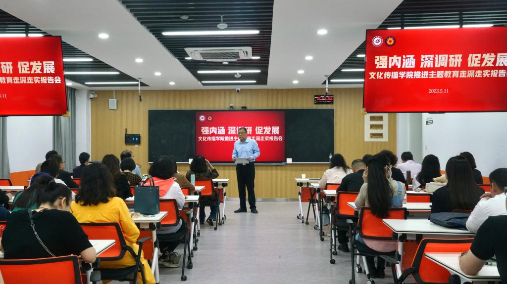5月11日,文化传播学院召开“强内涵 深调研 促发展”推进贯彻落实学习学习贯彻习近平新时代中国特色社会主义思想主题贯彻走深走实报告会,牢牢把握主题教育“学思想、强党性、重实践、建新功”总要求,以典型经验交流汇报的形式,聚焦党建引领、调研实践、产教融合、应用型人才培养、校企合作共建课程等当前学院事业发展中亟待解决的问题进行充分讨论。学校教务处处长孟凡兵、副处长冯素珍,教学质量监控与评估中心副处长尹荣,科研处副处长梁艳受邀出席会议,文化传播学院党委班子成员、全体教职工参会。党委书记王连峰主持会议。