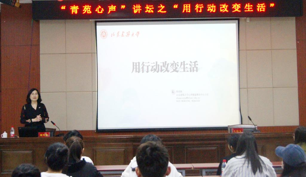 启动仪式结束后,山东建筑大学心理咨询中心主任周秀艳教授以“用行动改变生活”为主题做心理健康知识讲座。周讲座通过理论讲授、案例分析及情景模拟等方法为同学们阐述了正念对调节大学生日常生活和学习的积极作用及正念练习方法,并针对大学生如何科学应对和处理自身在学习和生活中的压力与情绪提供了切实可行的调适技巧,周教授的讲座理论知识丰富、案例分析清晰、现场互动热烈。