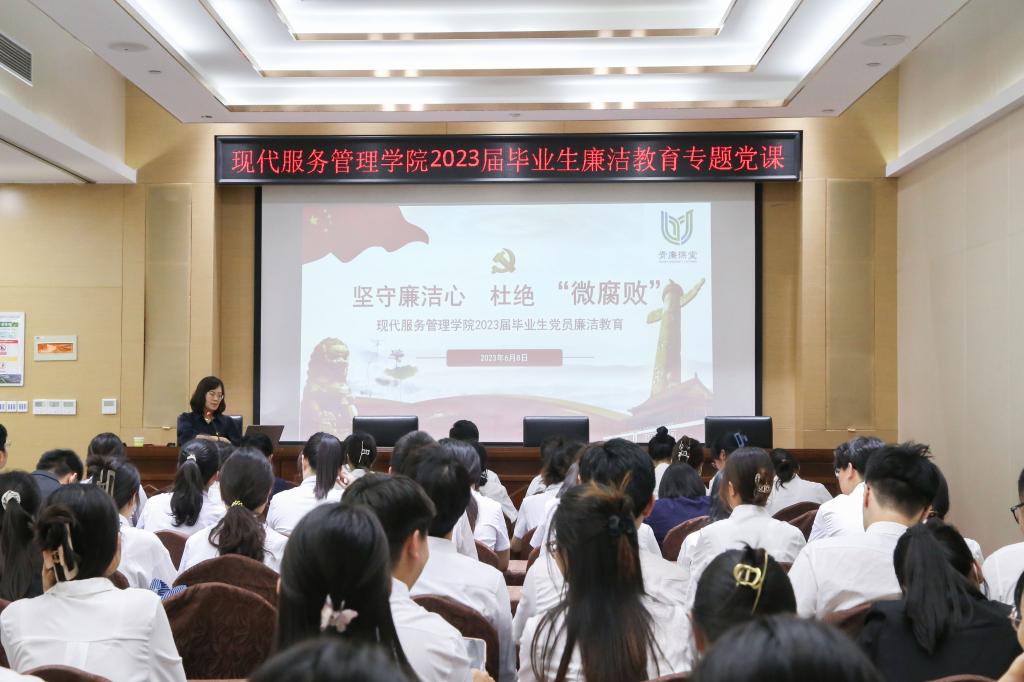 为深入开展学习贯彻习近平新时代中国特色社会主义思想主题教育,加强毕业生党员的党性修养和廉洁自律意识,引导毕业生党员扣好廉洁从业第一粒扣子,6月8日,现代服务管理学院副院长李丽讲授题为“坚守廉洁心,杜绝微腐败”的专题党课,2023届毕业生党员参加。