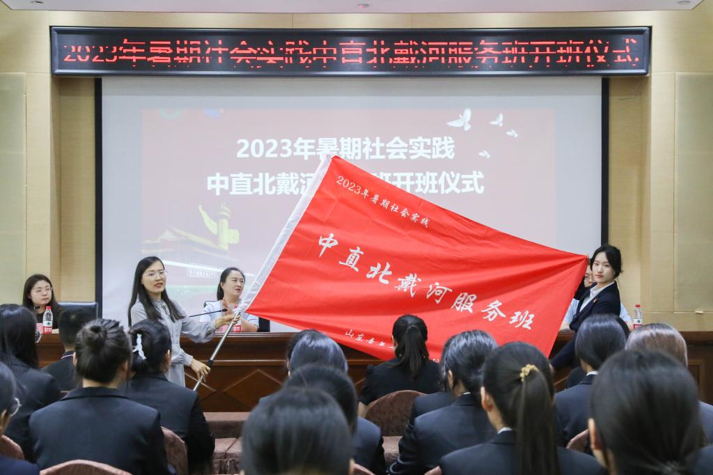 开班仪式上,王尚飞宣读了共青团山东青年政治学院委员会《关于同意成立北戴河服务班临时团支部的批复》。窦玉明向服务班授旗。学生代表冯雨婷作表态发言,围绕“恪守服务宗旨、端正服务态度、增强团体意识”代表全体成员作出郑重承诺,号召同学们以练促学、以学促能、学思践悟、知行合一,为暑期社会实践交出满意答卷。