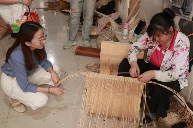 学院实践团队首先来到滨州市博兴县文化馆,馆工作人员卢博、霍晓亭,传承人代表张慧华及锦秋街道电商协会会长安宝忠向师生介绍了当地草柳编非遗产业现状、传承、生产性保护及辅助乡村振兴等相关情况,分别对自身从事非遗传承和研学领域的问题、建议进行了阐述。随后便开展了为期4天的草柳编技艺学习,传承人张慧华在非遗传习区带领学生们学习草柳编编织技艺,从草柳编的历史、编织材料、工艺品成型步骤等方面进行生动形象地讲解,同时手拿草柳编条,用灵巧多变的手法向学员展示编织步骤,并指出编织过程中应当注意的相关事项。大家在老师的指导下,边听边学、边学边练,将一根根细长的草柳条上下翻飞,折弯固定,一个个栩栩如生的草柳编工艺品就此展现在眼前。学生们纷纷表示“后期将会对草柳编工艺品进行再设计,运用所学的专业知识为非遗文化增添创新色彩。”最后,设计艺术学院产品设计专业教研室主任杨雪为卢博、张慧华颁发特聘证书,博兴县文化馆为学生颁发培训结业证书。