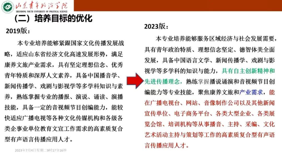 会议共分为三个环节。首先,王杨详细汇报了专业建设发展情况以及此次人才培养方案的修订情况,她介绍了专业在二十年发展进程中的诸多探索做法和教学特色,在国家级一流本科专业和全国党建工作样板支部“双品牌”建设驱动下,探索“思政+专业”耦合育人的培养路径,以思政育人为导向、以能力建构为核心,凝聚育人合力,创新“青年政治特色鲜明+‘播说诵演’能力突出”的“又红又专”的口语传播人才培养模式。同时,她从制定依据的来源、培养目标的优化、毕业要求与可考核指标点的契合、学分构成的情况、强化体系结构、主要创新点六方面详细阐述了新版人才培养方案的修订情况。
