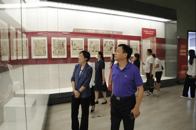随后,范红伟一行参观学习了“奋进新征程,建功新时代——红色济南手绘作品展”。该作品展精选了以党的重大历史事件、重要任务为创作题材的手绘艺术作品,以及历史文献资料、实物等,经过复制放大,以艺术的形式生动地反映了济南早起党组织的创建、斗争和发展历程。主题展通过绘画形式生动形象地还原了代表济南共产党早期组织出席中共一大的王尽美、邓恩铭为党鞠躬尽瘁的一生。参观展览的党员们纷纷表示深受震撼,老一辈革命先烈无私奉献、敢于牺牲的精神值得学习,在今后的工作生活中将时刻用先辈的事迹和精神激励自己。