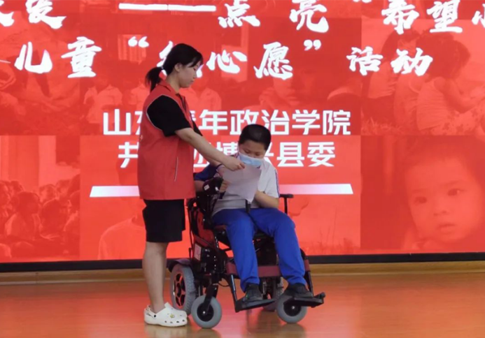 活动现场博兴团县委书记成程对于我校前来参与此次活动表示热烈的欢迎,并介绍了博兴县“牵手关爱”——点亮“希望小屋”儿童“微心愿”项目实施情况,为更好的帮扶“希望小屋”困难儿童健康成长,通过前期征集共发布儿童“微心愿”28个,全部由我校认领并点亮。活动现场,轮椅、书包等充满希望的爱心物品都一一送到了受助儿童的手中,一辆崭新的轮椅加快了求学的脚步,一个全新的书包装下了对未来的期许。