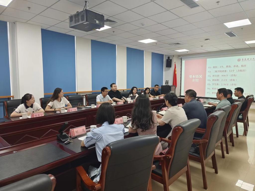 当天,调研团还到青岛理工大学开展座谈调研,座谈会上,青岛理工大学团委书记苏伟对调研团队一行表示热烈欢迎,详细介绍了青岛理工大学共青团基本情况,围绕共青团在思想引领、团学改革、服务青年和大局贡献度等方面取得的工作成效进行充分交流。苏伟表示,希望两校团委能继续保持联系,进一步加强交流互访、互学互鉴、共同进步。双方就党建带团建、基层团组织建设、第二课堂成绩单制度、学生社团管理等工作进行了深入探讨。青岛理工大学机械与汽车工程学院、理学院、商学院团委书记分别围绕党建带团建、思想引领、科技创新、人才培养等方面进行经验分享。会后,调研团队一行实地参观青岛理工大学共青团、学生会组织阵地建设情况。