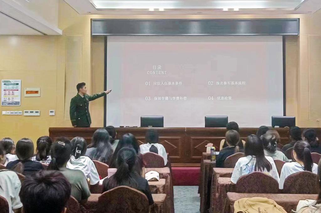 为扎实做好大学生征兵工作,进一步动员更多大学生参军入伍,激发学生参军报国热情,9月14日现代服务管理学院在礼行楼举行了2023级新生征兵入伍宣讲。宣讲成员由2022级、2023级物业管理(专升本)退伍大学生组成。