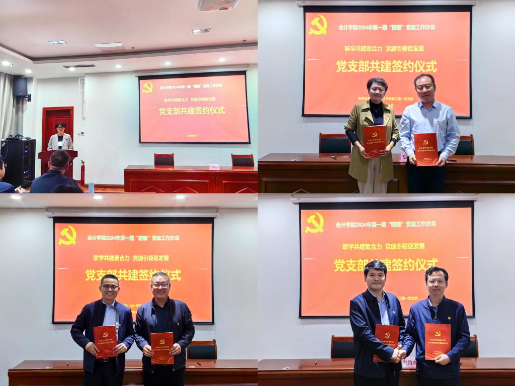 在专业共建环节,会计学院举办2024年第一期“稻穗”党建工作沙龙暨党支部共建签约仪式,学校机关党委副书记尹荣作为代表发言,财务处党支部、审计处党支部和资产管理处党支部分别与会计学院教工第一、第二党支部签订结对共建协议书,期待通过深入实施“党建+”工程,赋能党建与业务融合发展,促进各基层党组织在党建作用发挥、学科专业建设、干部队伍培育等多渠道、多层次、多维度取得更加显著的赋能成效。会计学院教工第一党支部依托财务管理和资产评估专业,探索出一套符合自身工作实际的党建与业务互融共促的“四+铸育”特色品牌。教工第二党支部依托审计学和会计学专业,以一流专业学科发展,实现党建与业务协同发展的互为融合模式。