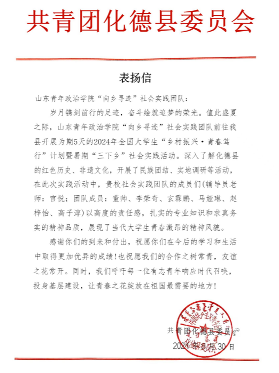 信中表示,在此次实践活动中,外国语学院“向乡寻迹”社会实践团队于内蒙古自治区化德县开展为期5天的调研活动。调研期间,团队成员以高度的责任感,扎实的专业知识和求真务实的精神品质,深入了解化德县的红色历史、非遗文化,开展了民族团结、实地调研等活动,展现了当代大学生青春激昂的精神风貌。