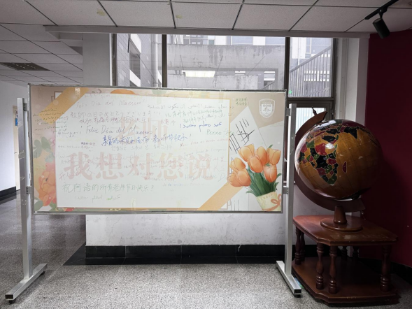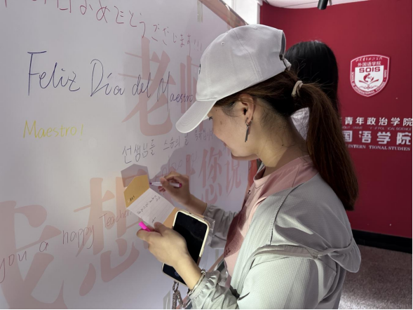 弘扬教育家精神,营造尊师重教氛围。来自七个外语专业的同学们手写外语祝福,表达对广大教师们的感恩之情。同时,学院通过电子展示屏滚动展示“教师节快乐”“大力弘扬教育家精神,加快建设教育强国”等内容,为教师送上温馨祝福,大力弘扬优秀尊师文化,营造浓厚的节日氛围。