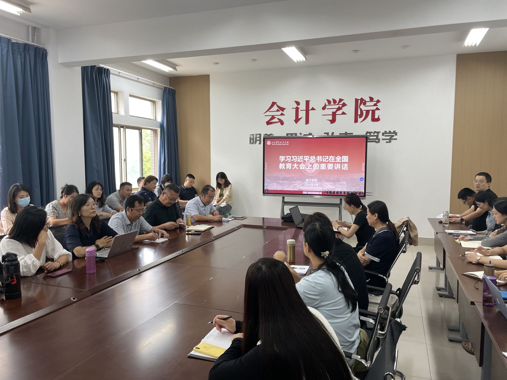 9月11日,会计学院召开教职工大会,专题学习习近平总书记在全国教育大会上的重要讲话,传达全国教育大会精神。党委书记姜宏宝领学,学院全体老师参加会议。