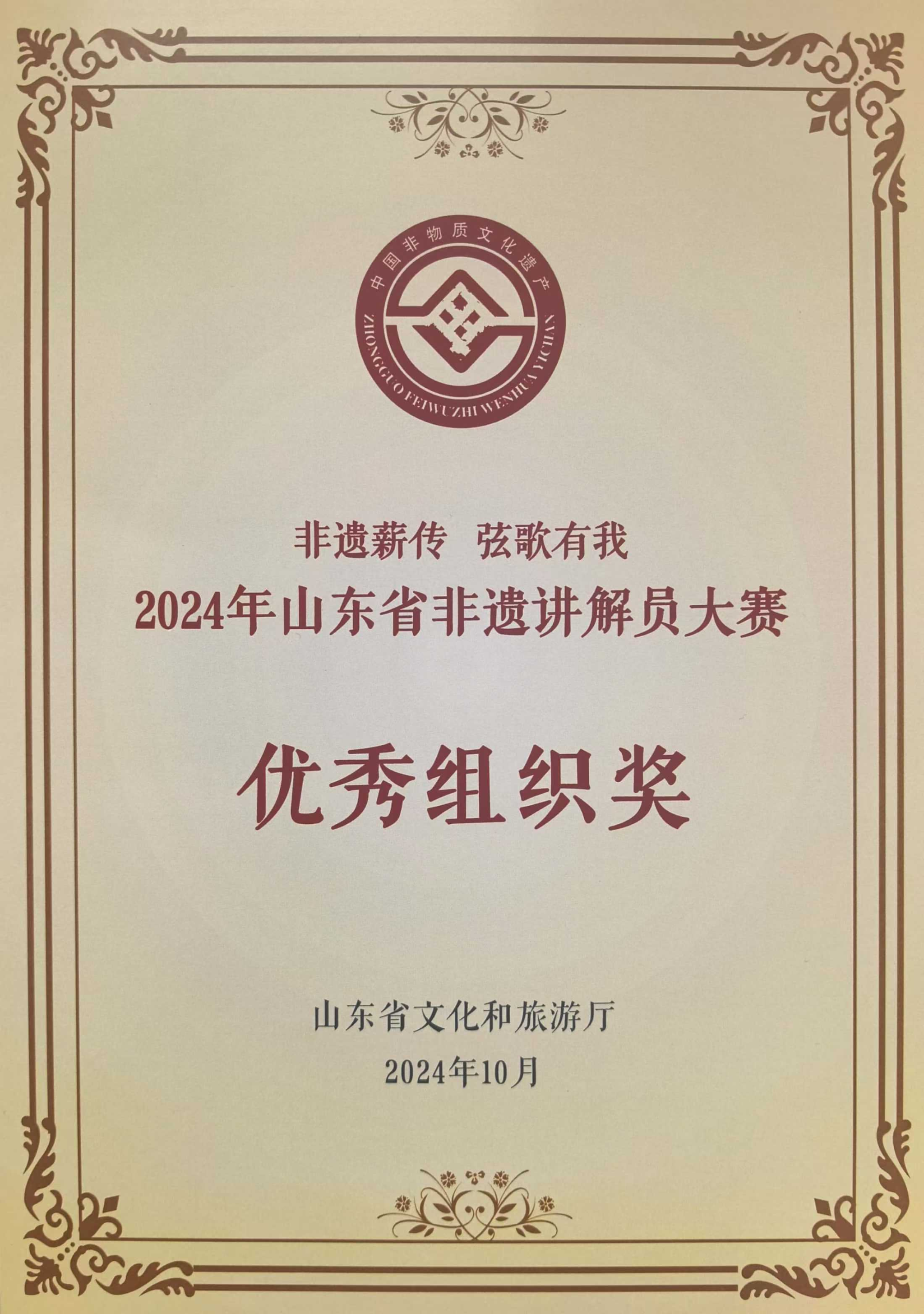 10月27日至28日,由山东省文化和旅游厅主办的“非遗薪传 弦歌有我”2024年山东省非遗讲解员大赛决赛暨颁奖仪式在泰山大剧院举行。山东省文化和旅游厅二级巡视员刘显世,泰安市委常委、宣传部部长王爱新等出席活动。我校在此次活动中获得优秀组织奖,我校学子获得优秀奖。