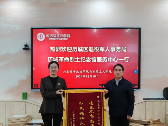 武继海代表历城区退役军人事务局历城革命烈士纪念馆服务中心向学校赠送锦旗,赞扬学校马克思主义学院师生在志愿服务工作中的突出表现,肯定师生的辛勤付出,这不仅是对学校志愿服务工作的认可,更是对广大师生传承红色文化、投身社会公益事业的有力鼓舞。