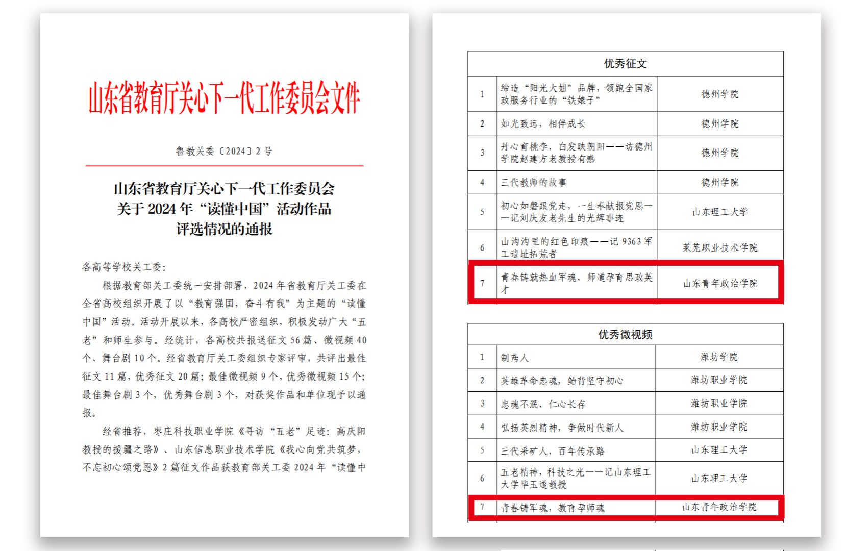 12月25日,学校收到山东省教育厅关心下一代工作委员会印发的《山东省教育厅关心下一代工作委员会关于2024年“读懂中国”活动作品评选情况的通报》,我校报送作品《青春铸就热血军魂,师道孕育思政英才》《青春铸军魂,教育铸师魂》分别获评优秀征文、优秀微视频。