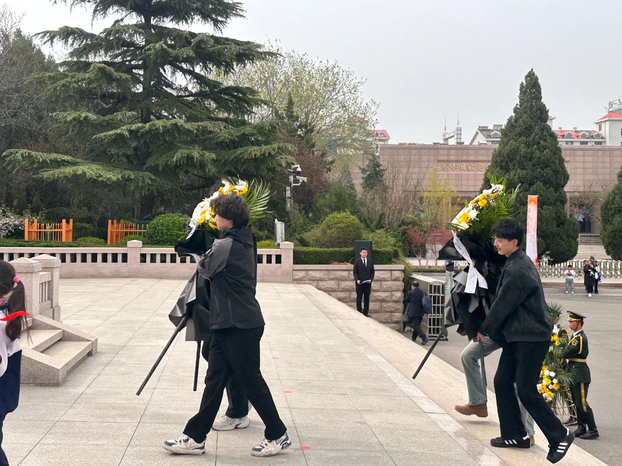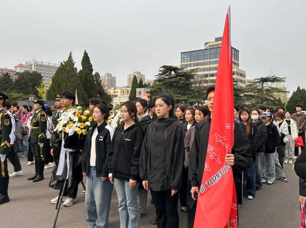 祭奠仪式在国歌声中拉开帷幕,全场静默肃立,深切缅怀为争取民族独立和人民解放、实现国家富强和人民幸福而英勇献身的革命英烈,以无声的致敬传递永恒的追思。花篮敬献环节中,松柏凝翠,阳光穿透云层洒落碑前,象征着革命精神与新时代青年的血脉传承。