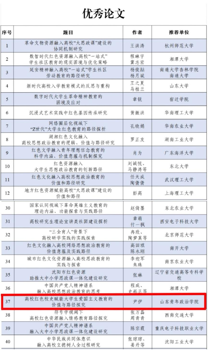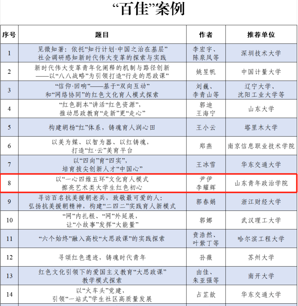近日,《高校辅导员》编辑部、高校思想政治工作队伍培训研修中心(山东大学)发布了《2024年高校思想政治工作优秀文章征集活动评选结果的公示》,我校辅导员尹伊等《以“一心四维五环”文化育人模式擦亮艺术类大学生红色初心》案例入选“百佳”案例,《高校红色校史赋能大学生爱国主义教育的价值与路径研究》入选优秀论文。