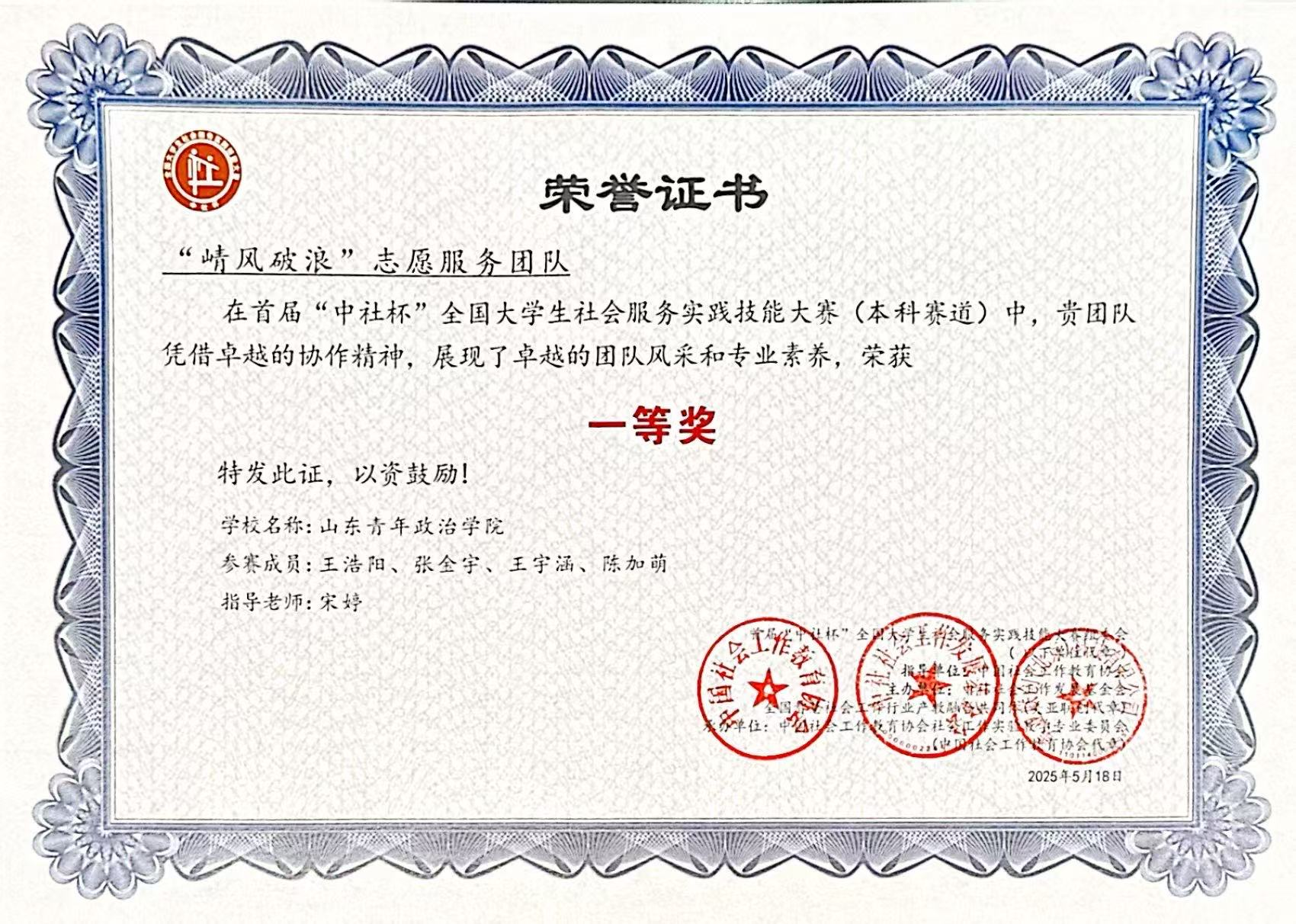 5月17日至18日,首届“中社杯”全国大学生社会服务实践技能大赛圆满收官。我校政治与公共管理学院社会工作专业王浩阳、张金宇、王宇涵、陈加萌四位同学组成的“崝风破浪”志愿服务团队在指导教师宋婷的指导下,经过初赛、决赛,在全国百余支队伍的激烈比拼中脱颖而出,最终取得了本科组一等奖的好成绩。