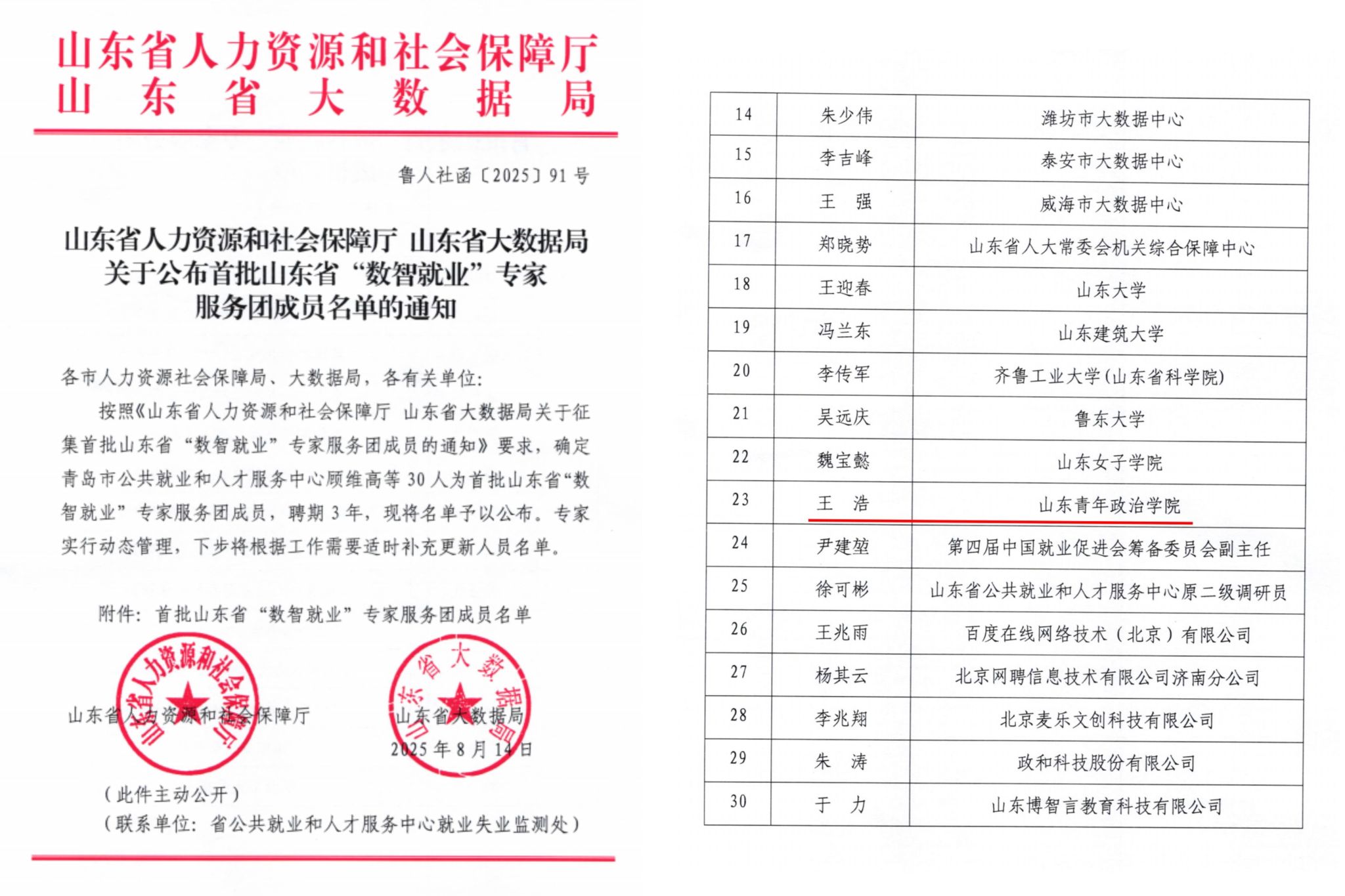 8月28日,山东省人力资源和社会保障厅、山东省大数据局联合印发了《关于公布首批山东省“数智就业”专家服务团成员名单的通知》(鲁人社函〔2025〕91号),我校学生工作处王浩入选首批山东省“数智就业”专家服务团成员。