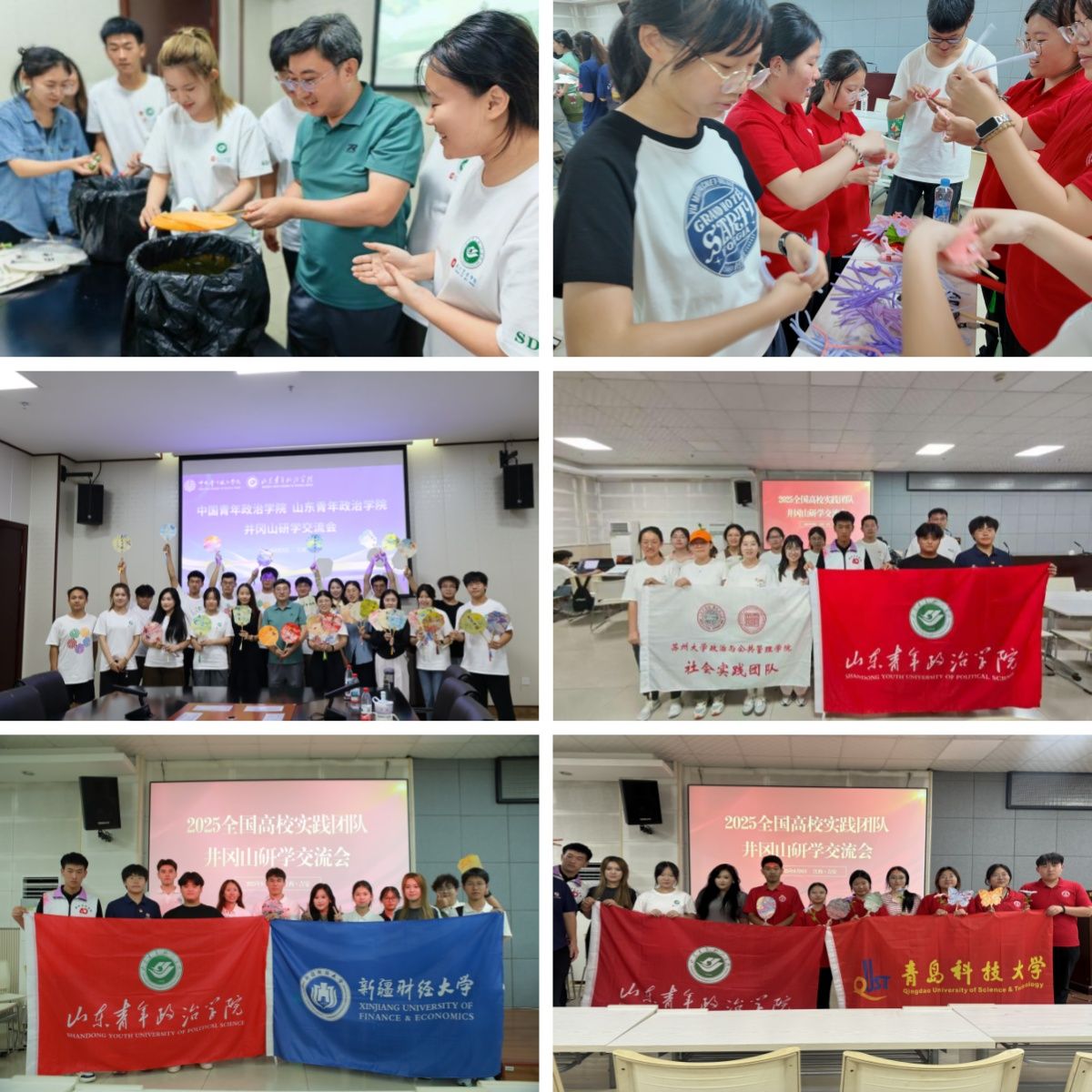 “艺绘青锋”实践团队依托设计艺术学院作为山东省非物质文化遗产实践教学基地和研究基地的资源,积极与中国地质大学(武汉)、吉林大学、中国青年政治学院、南京工业大学、西南政法大学、云南农业大学、青岛科技大学等十余所高校开展井冈山研学校际交流。交流会上,实践团队成员携漆扇、绒花技艺亮相,与其他高校伙伴围坐一起,用漆料晕染井冈红,用绒花丝线勾勒杜鹃花,同上一堂“非遗艺术党课”。“漆料晕染的是革命热血,更是我们这代人的赤诚。”其他高校参与学生捧扇感叹。当绒花杜鹃在井冈翠竹前绽放,非遗被赋予“红色基因青春载体”的新内涵,也在跨越地域的校际信仰对话中架设情感联结之桥,奏响青春向党的红色和声。