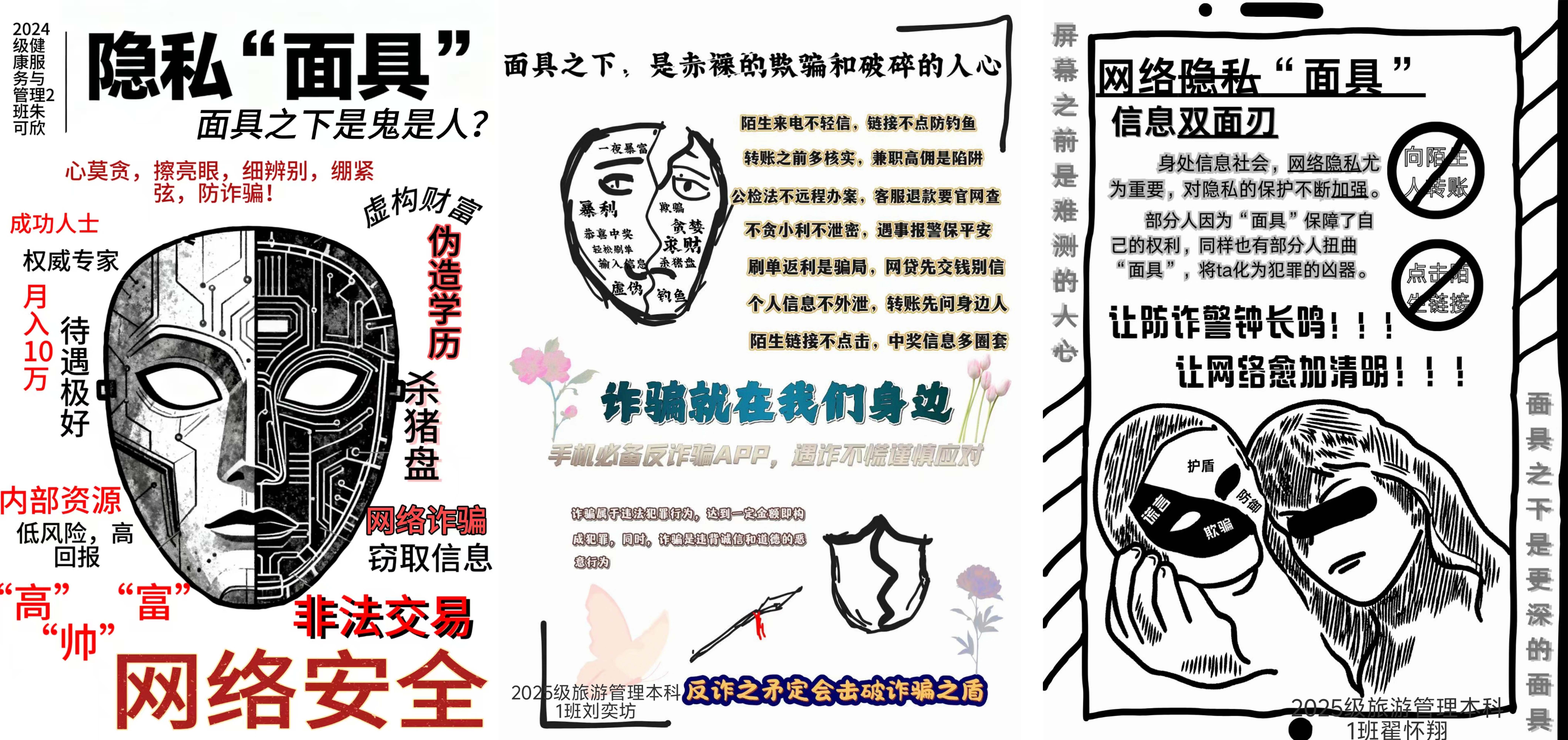 为全面提升教育吸引力与实效性,9月16日—21日,学院组织开展多项特色实践活动。组织学生积极参与“全国大学生网络安全知识竞答”,以闯关答题推动安全知识转化为行为习惯;举办“隐私面具”创意设计大赛,以46件海报、数字作品的艺术创作传递隐私保护理念;设置“安全宣言打卡墙”,师生书写安全承诺集中展示,以仪式感凝聚防护共识。丰富的活动载体让网络安全意识深入人心,为构建全员参与、全程防控的校园网络安全生态注入了持久动力。