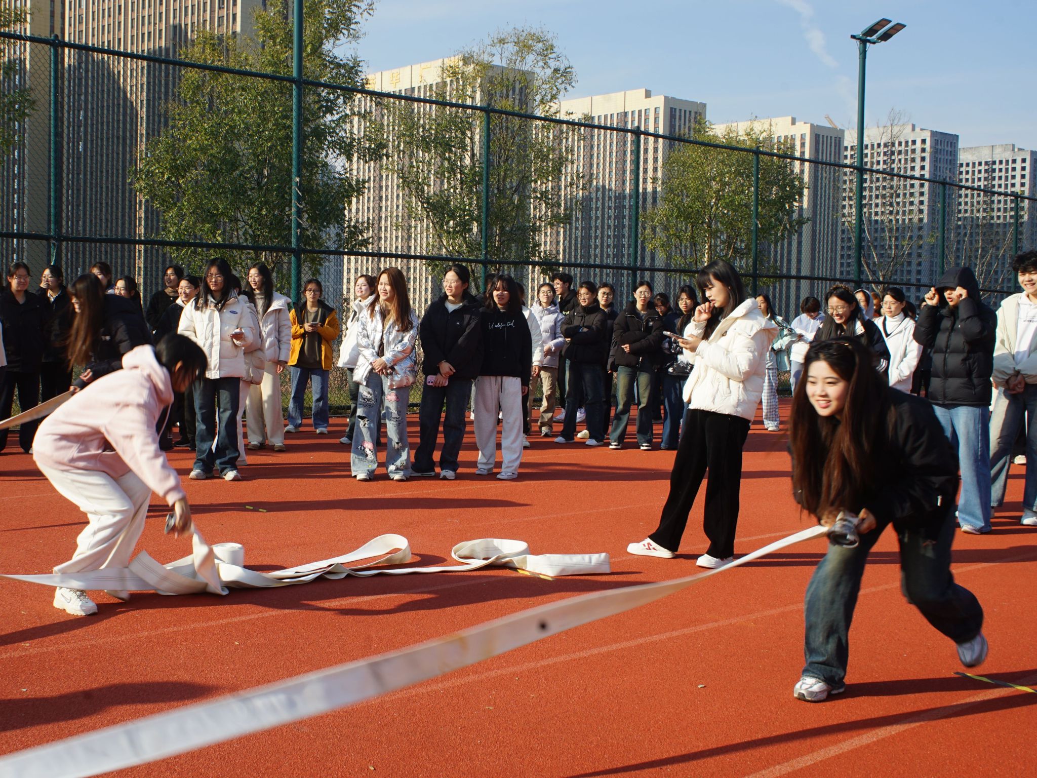 本次运动会巧妙融合趣味性与竞技性,共设置了消防水带接力、灭火器接力折返跑、消防障碍跑、竞速取水接力赛、六人七足、动力火车、拔河等七个竞技类项目以及模拟灭火、模拟火场逃生等两个体验类项目。活动通过寓教于乐的形式,生动普及了消防应急处置知识,实现了安全知识宣传与实战技能演练的深度融合。比赛现场,各学院参赛代表默契配合、团结协作,尽情展现青春活力。同学们在实战比拼与沉浸式体验中,熟练掌握了消防器械的操作要领和应急逃生的实用技能,有效提升了学生安全防范意识与自我保护能力。