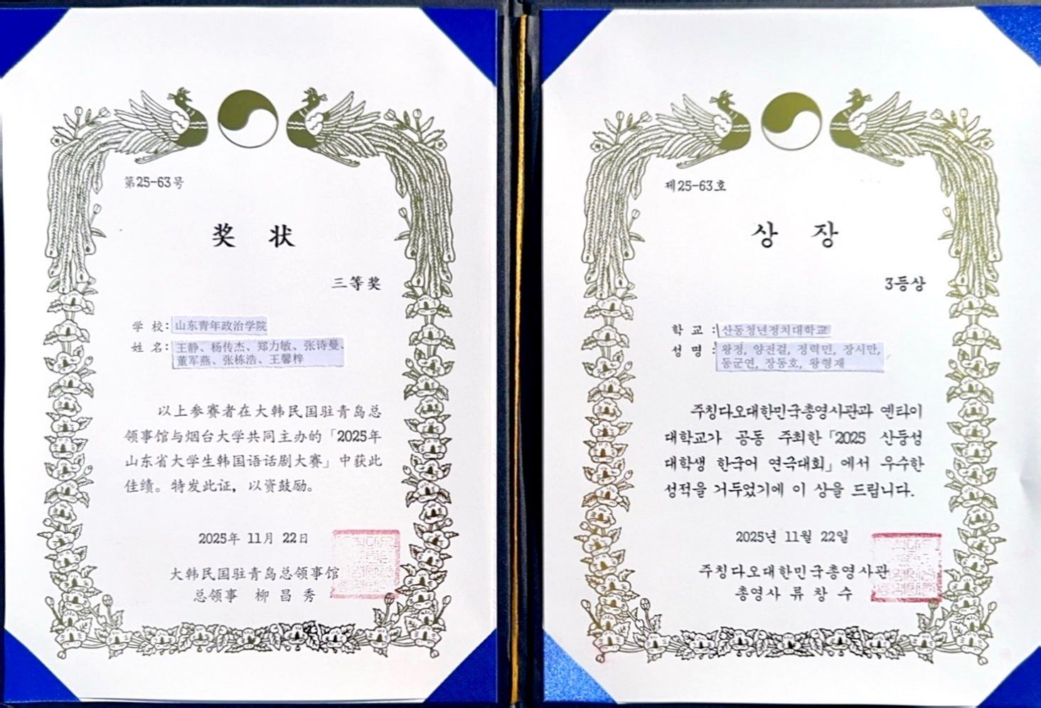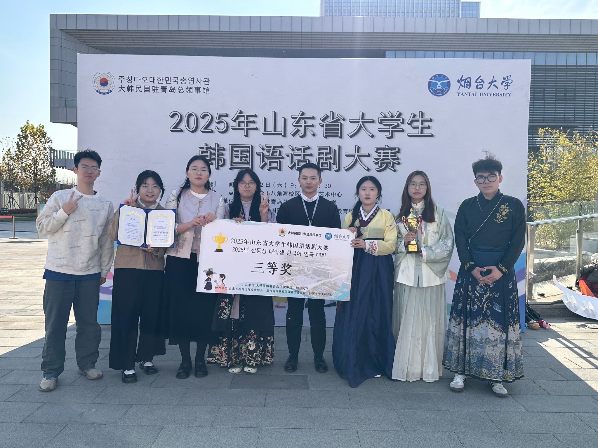 11月22日,由烟台大学与大韩民国驻青岛领事馆共同主办的“2025年山东省大学生韩国语话剧大赛”在烟台大学八角湾校区成功举办。本次大赛共有来自全省高校的15支队伍参赛,学校外国语学院朝鲜语专业代表队凭借出色的表现脱颖而出,在决赛中荣获三等奖。