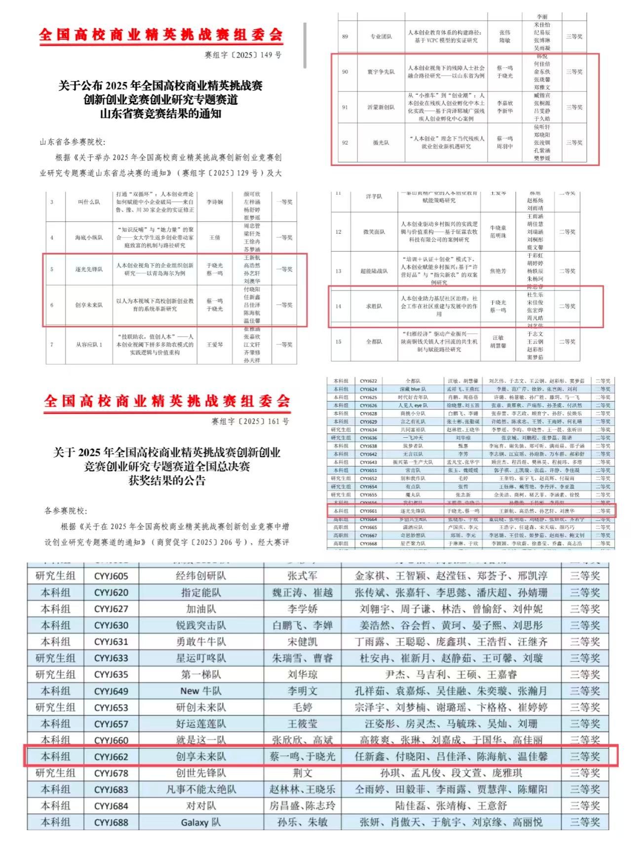 在山东省赛阶段,学院六个参赛团队凭借高质量的研究成果脱颖而出:“人本创业视角下的企业组织创新研究——以青岛海尔为例”等两个项目斩获省级一等奖;项目“人本创业助力基层社区治理:社会工作在社区重建与发展中的作用”获省级二等奖;“人本创业视角下的残障人士社会路径研究——以山东省为例”等三个项目获省级三等奖。其中,“逐光先锋队”与“创享未来队”凭借省赛优异表现成功晋级全国总决赛。