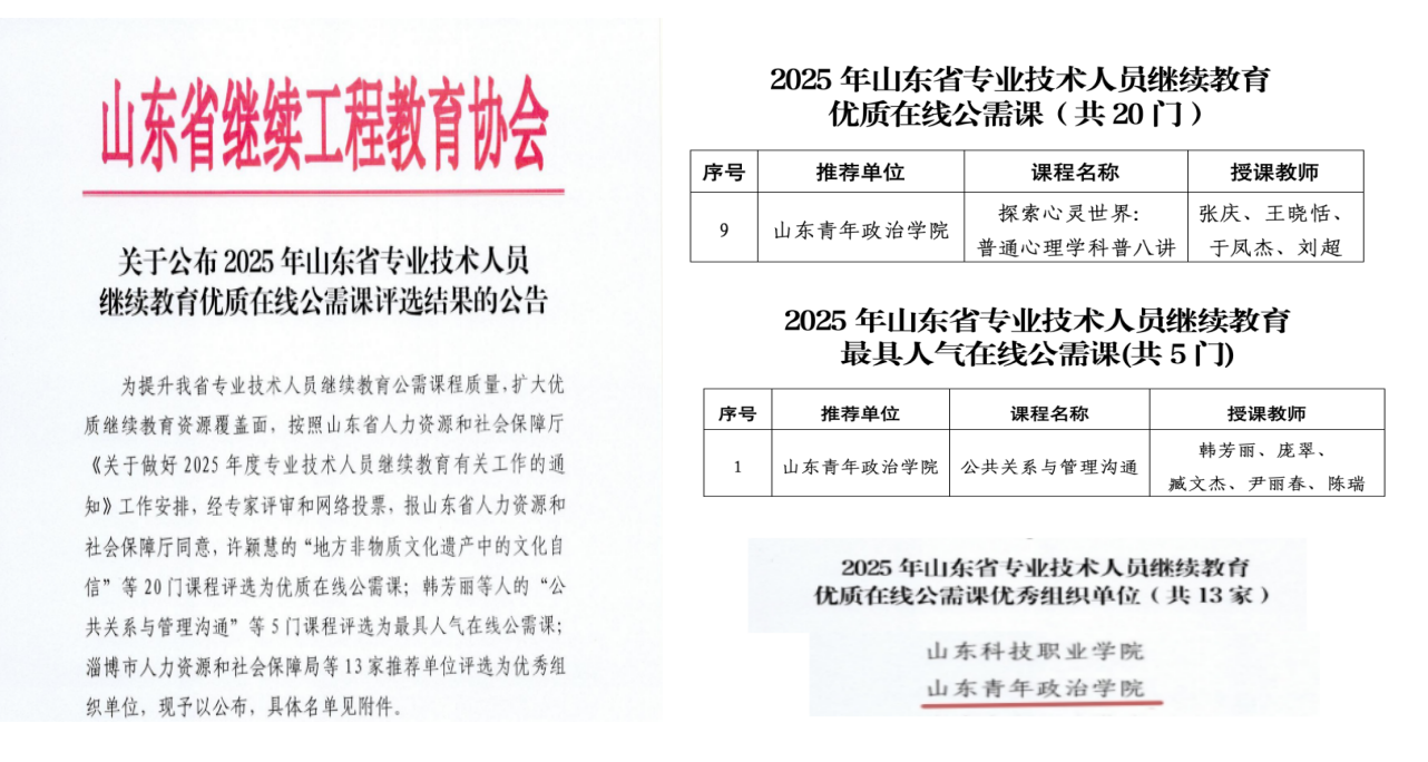 近日,2025年度山东省专业技术人员继续教育优质在线公需课评选结果公布。本次评选活动由山东省人力资源和社会保障厅统筹、山东省继续工程教育协会组织,面向全省征集优质课程。我校申报的两门课程经学校录制报送、专家评审和网络投票,从众多课程中脱颖而出,其中《探索心灵世界:普通心理学科普八讲》获评优质在线公需课,《公共关系与管理沟通》获评最具人气在线公需课,同时,学校被评为山东省专业技术人员继续教育优质在线公需课优秀组织单位。