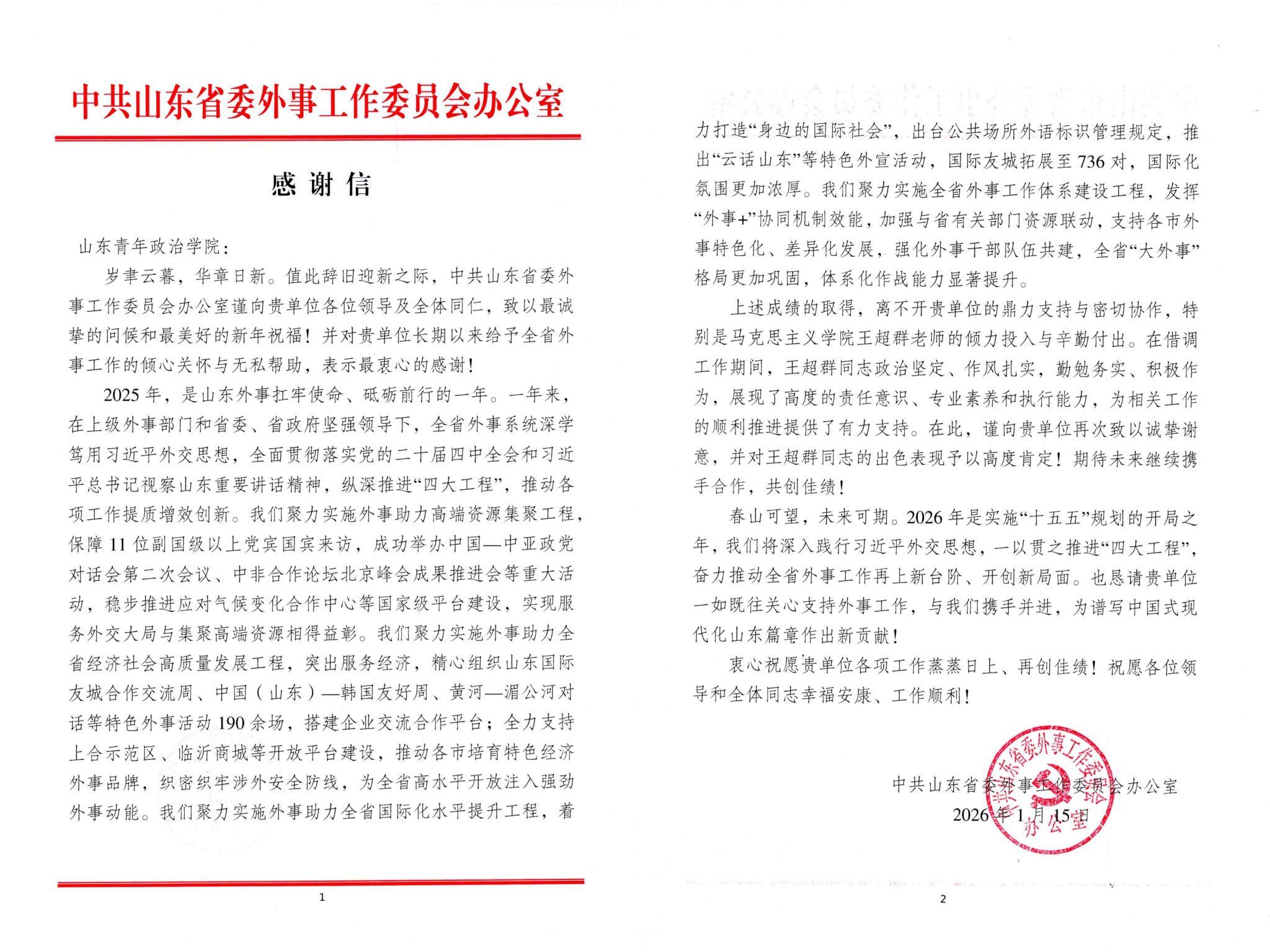 感谢信回顾了2025年全省外事工作取得的丰硕成果。信中指出,在借调工作期间,王超群同志政治坚定、作风扎实、勤勉务实、积极作为,展现了高度的责任意识、专业素养和执行能力,为相关工作的顺利推进提供了有力支持,对王超群同志的出色表现予以高度肯定。省外办对学校致以诚挚谢意并表示,希望未来学校一如既往关心支持外事工作,双方携手并进,为谱写中国式现代化山东篇章作出新贡献。