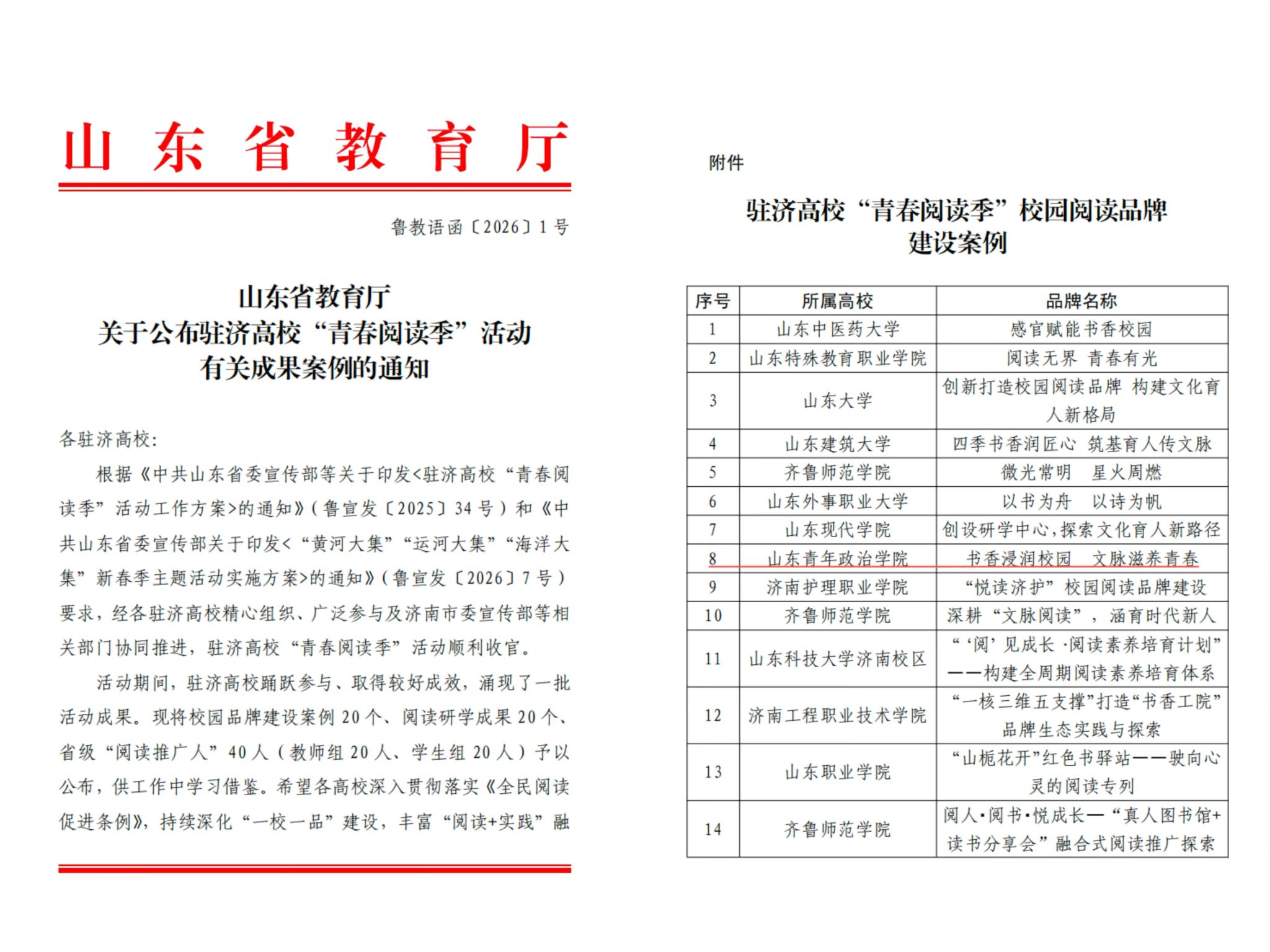 近日,从山东省教育厅《关于公布驻济高校“青春阅读季”活动有关成果案例的通知》(鲁教语函〔2026〕1号)获悉,学校荣获校园阅读品牌建设案例1个、阅读研学成果2个、省级“阅读推广人”1人等多项荣誉。