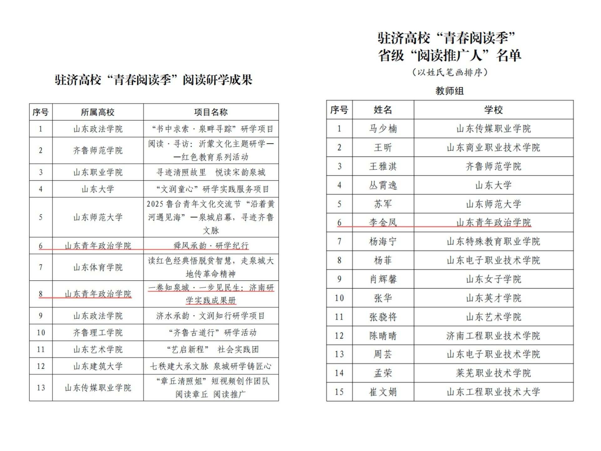 本年度驻济高校“青春阅读季”活动自2025年10月启动以来,学校高度重视,研究制定《山东青年政治学院“青春阅读季”活动工作方案》,组织开展了“八个一”系列行动,举办一场图书文化市集、推荐一批好书榜单、共上一节“红色经典”思政课、开展一系列“名家读书分享会”、组织一场“读济南故事,走泉城大地”高校师生阅读研学活动、选树一批“阅读推广人”、举办一次高校阅读短视频大赛、组织开展一场主题班会。下一步,学校将深入贯彻落实《全民阅读促进条例》,持续深化校园阅读品牌建设,丰富“阅读+实践”融合路径,带动更多师生参与阅读推广活动,让爱读书、读好书、善读书的风尚蔚然成风。