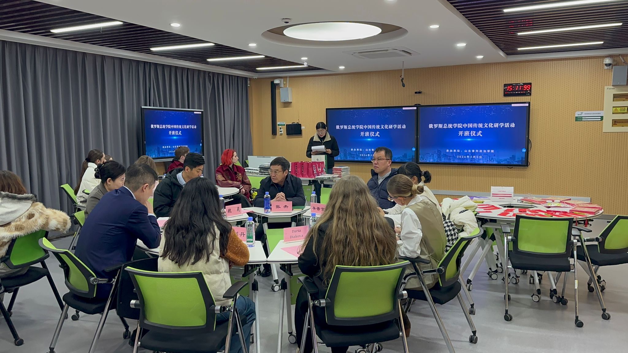 2月5日,研学活动开班仪式在学校知行楼举行。张杰在致辞中表示了对俄方师生的欢迎,并介绍学校的办学定位、学科特色与国际化发展路径。俄罗斯总统学院国际交流处处长Karolina Sikirinskaya等嘉宾相继发言,表达对此次研学之旅的期待。仪式中,中方向俄方师生赠送具有中国文化特色的纪念礼品,并安排了传统文化体验环节,进一步拉近了彼此距离。