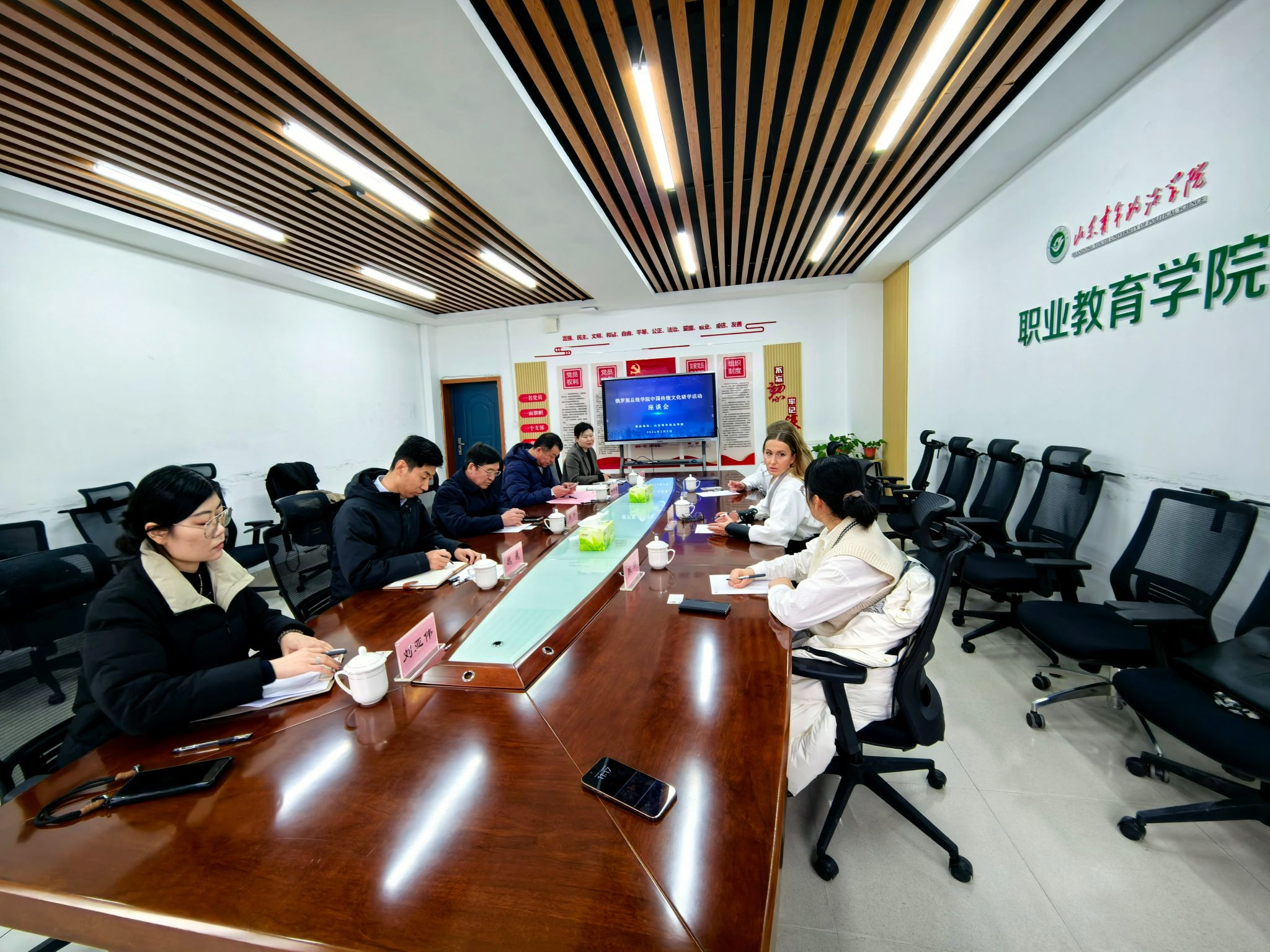 俄罗斯总统学院国际交流处处长Karolina Sikirinskaya、外国留学生招生办专管员Daria Diakova与山东青年政治学院校方代表进行了深入交流。俄方代表分享了在国际化办学与文化传播方面的经验,中方代表则从齐鲁文化底蕴和学校办学实践出发予以回应。双方就未来拓展合作领域、深化交流机制等方向交换了意见,并在加强青年培养方面达成初步共识。