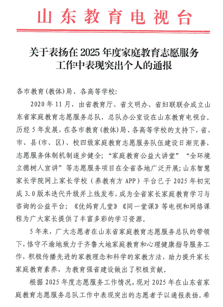 近日,山东教育电视台发布《关于表扬在2025年度家庭教育志愿服务工作中表现突出个人的通报》,对山东省家庭教育志愿服务总队里表现优异的志愿者进行表彰。我校于凤杰老师凭借扎实的专业素养和显著的工作业绩成功入选,为学校赢得了荣誉,也为全体教师树立了典范。