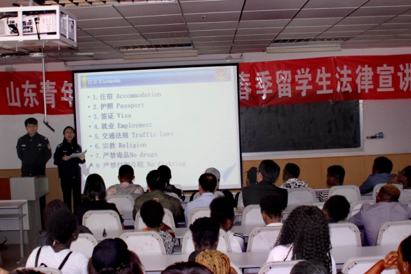 为进一步增强我校国际学生遵纪守法意识,提高自我保护能力,创建平安校园,5月13日,经济管理学院举办国际学生法律知识宣讲会,宣讲会邀请了济南市公安局历城区分局出入境管理科的三位警官就来华国际学生如何认真遵守中国法律法规进行了系统宣讲。学生工作处处长蒋涛涛、国际交流合作处处长席岩、安全管理处副处长陈海涛、经济管理学院团总支书记赵新燕等老师及在校国际学生参加了本次宣讲会。宣讲会由国际教育教研室主任张金主持。