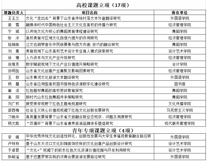山东省艺术科学重点课题评审办公室于7月16日公布了2021年度山东省艺术科学重点课题立项项目名单,全省高校课题立项640项,文化单位课题立项130项,青年专项课题立项200项。我校此次共申报46项,21项课题获批立项,其中高校课题17项,青年专项4项,具体情况如下(排名不分先后):